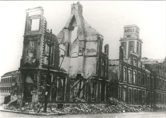 Moviliza a otros cerveceros para la reconstrucción de Lovaina tras los intensos bombardeos que causaron graves daños a la fábrica de cerveza y a las casas de los trabajadores.