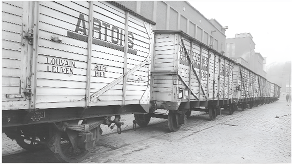 Moviliza a otros cerveceros para la reconstrucción de Lovaina tras los intensos bombardeos que causaron graves daños a la fábrica de cerveza y a las casas de los trabajadores.